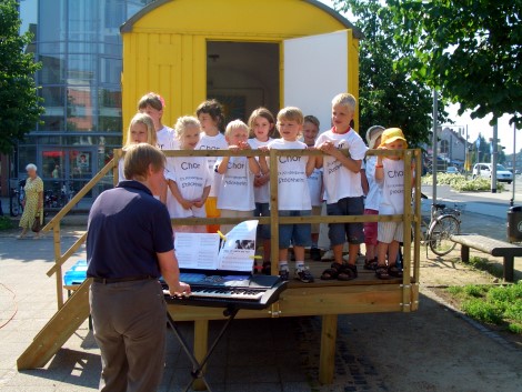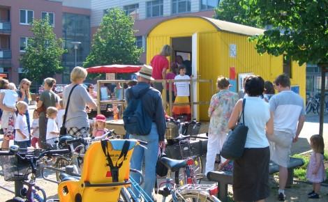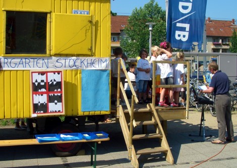 Der Bauwagen auf dem Stöckheimer Markt - die Vorführung läuft bereits!